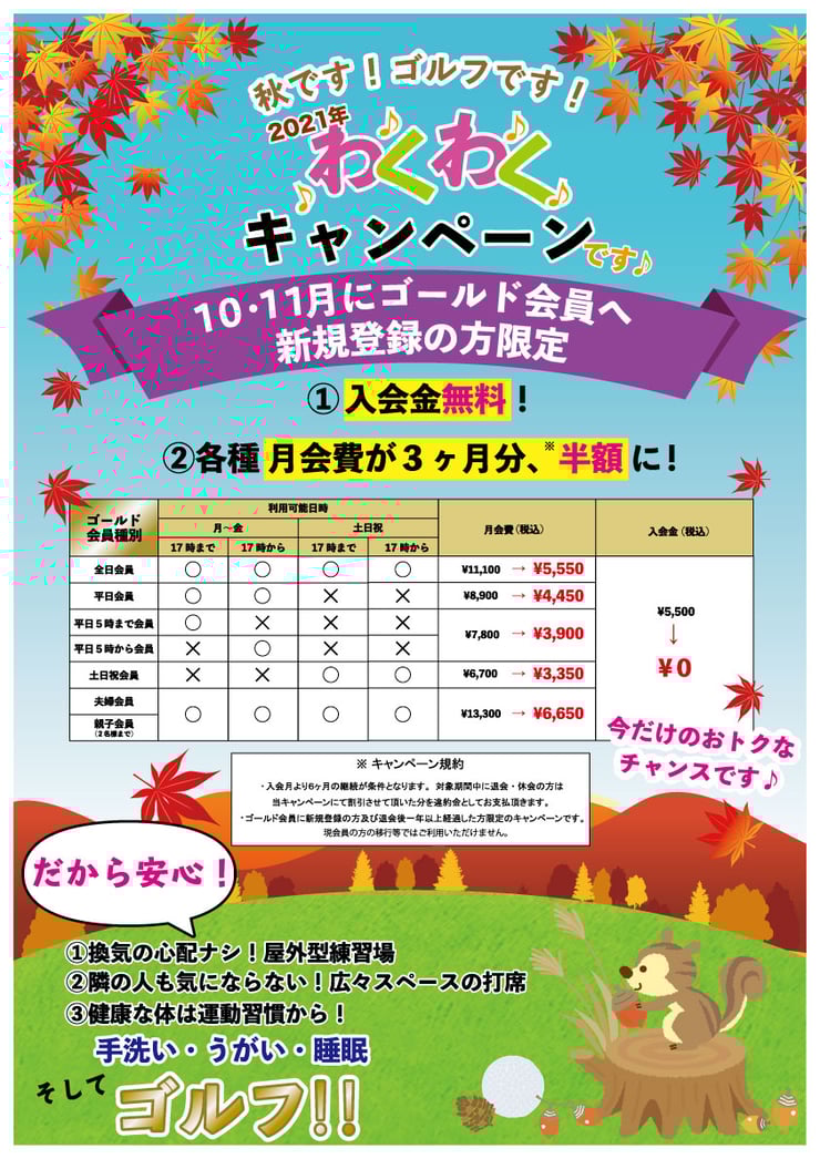 2021年秋もお得なチャンスです!密閉の心配のない屋外施設なので、思う存分スポーツの秋を楽しめますよ♪