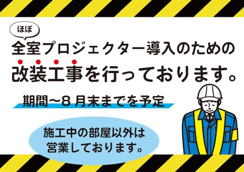 ただいまカラオケバンダイ鈴鹿ハンター店では、ほぼ全室へのプロジェクター導入のための改装工事を行っております。工事期間は8月末頃までを予定しております。工事実施中も施行中以外のお部屋は営業しておりますが、ご利用いただける部屋数が限られます。お客様には大変ご不便をおかけいたしますが、ご理解ご協力のほどよろしくお願いいたします。