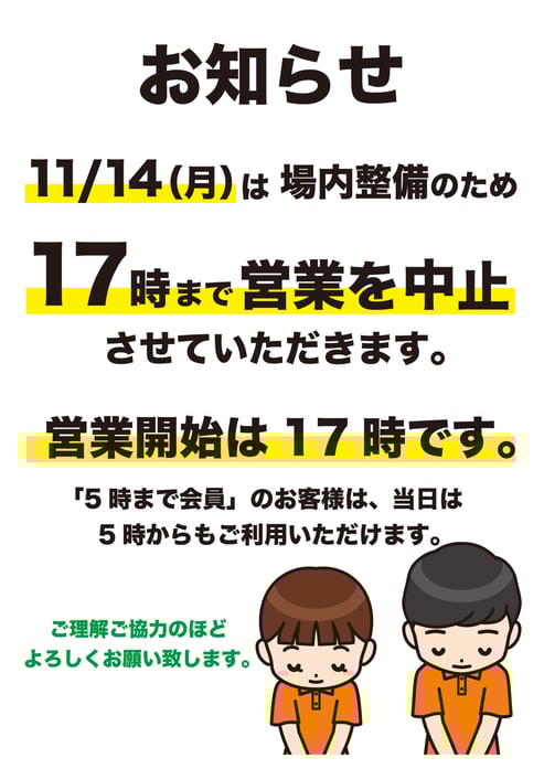 2022年11月14日(月) は、場内整備のため17時まで営業を中止させていただきます。