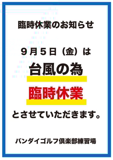 2025年9月5日(金)は、台風による影響が予想される為臨時休業とさせていただきます。お客様にはご迷惑をお掛け致しますが、ご理解のほどよろしくお願いいたします。