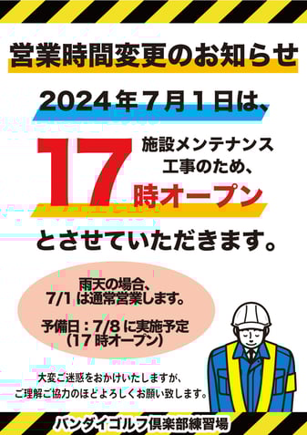 バンダイゴルフ倶楽部練習場におきまして施設メンテナンス工事を実施いたしますため、2025年5月19日(月)は営業時間を下記の通り変更とさせていただきます。